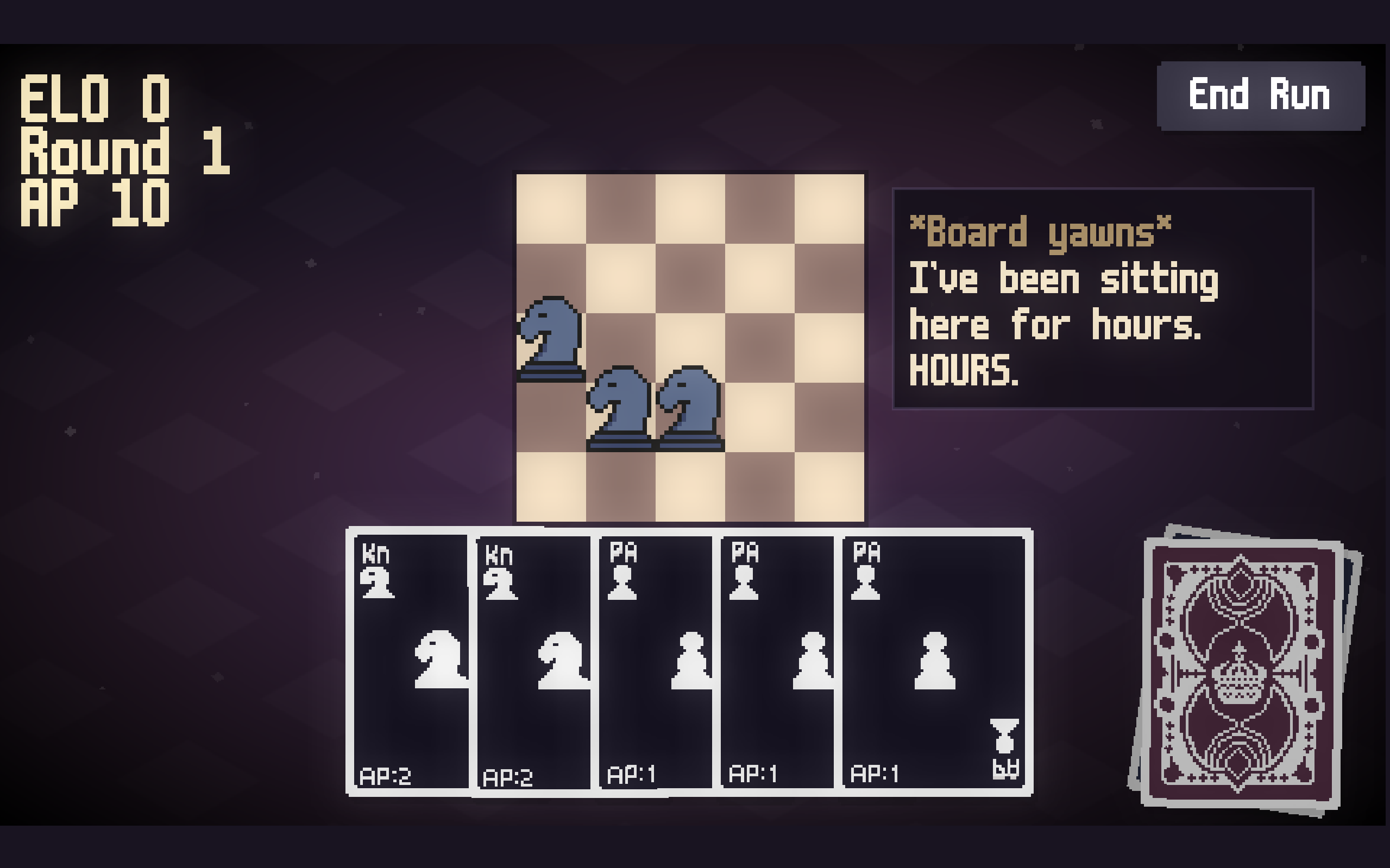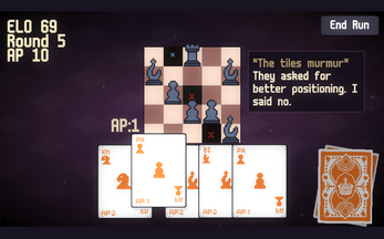 Drag chess piece cards onto a 5×5 board to capture enemies. Each card costs AP : run out and it's game over. The board has opinions about your plays.